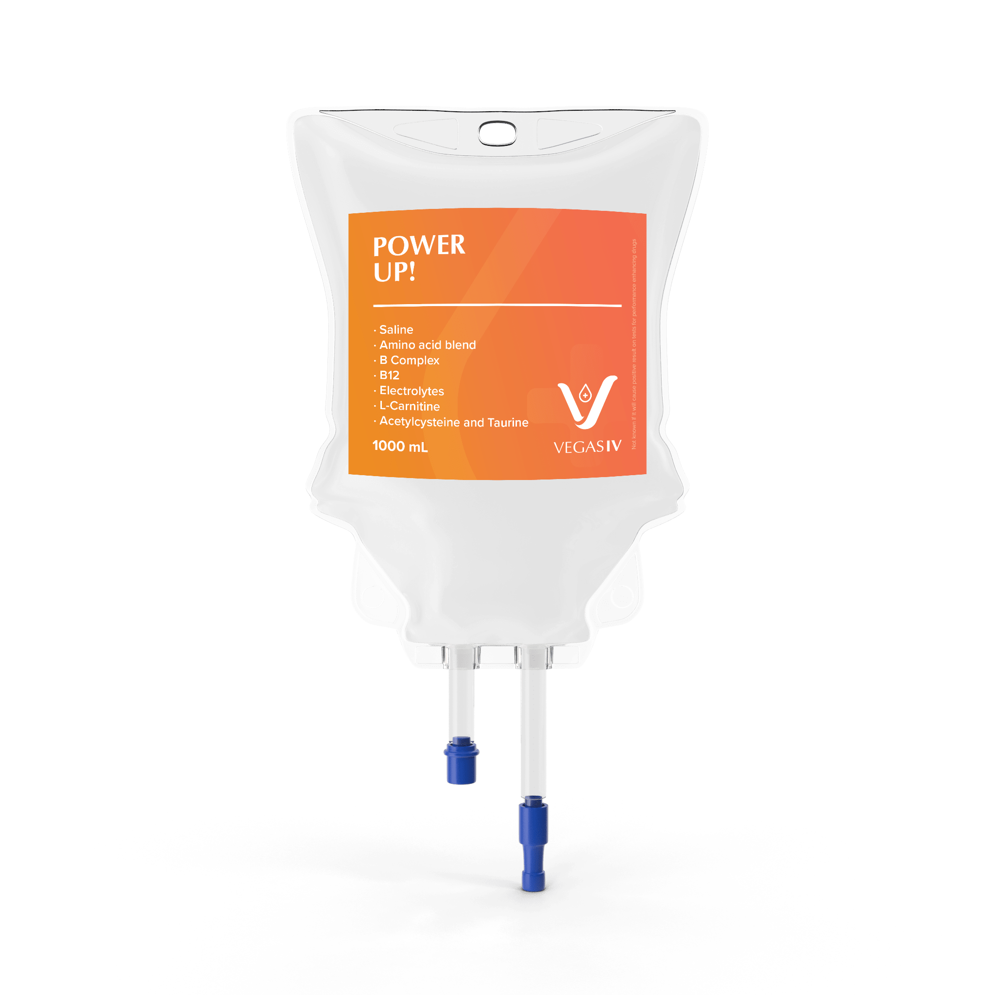 Our 'Power Up!' infusion combines hydrating saline fluid with our blend of amino acids**. Additionally, we include our B Complex of vitamins (B1, B2. B3, B5, and B6) as well as B12 to help reduce stress on the body and improve energy. Electrolytes are included to replenish what's lost during physical activity.
